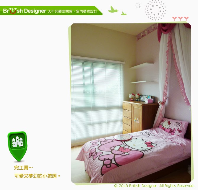 這果真是名副其實的Kitty 瘋~ ...嗑喀喀....更正一下,是Kitty風~ 超級夢幻城現在您眼前~ 我想您應該也會受不了吧!! 實在是太可愛了~ 屋主真的非常的用心~我們依照屋主想要的夢幻風訂製了這個床頭,在下方綁紗的部分還是屋主自己提供的Kitty來做裝飾,在下真的是配服到不行唷~~~~